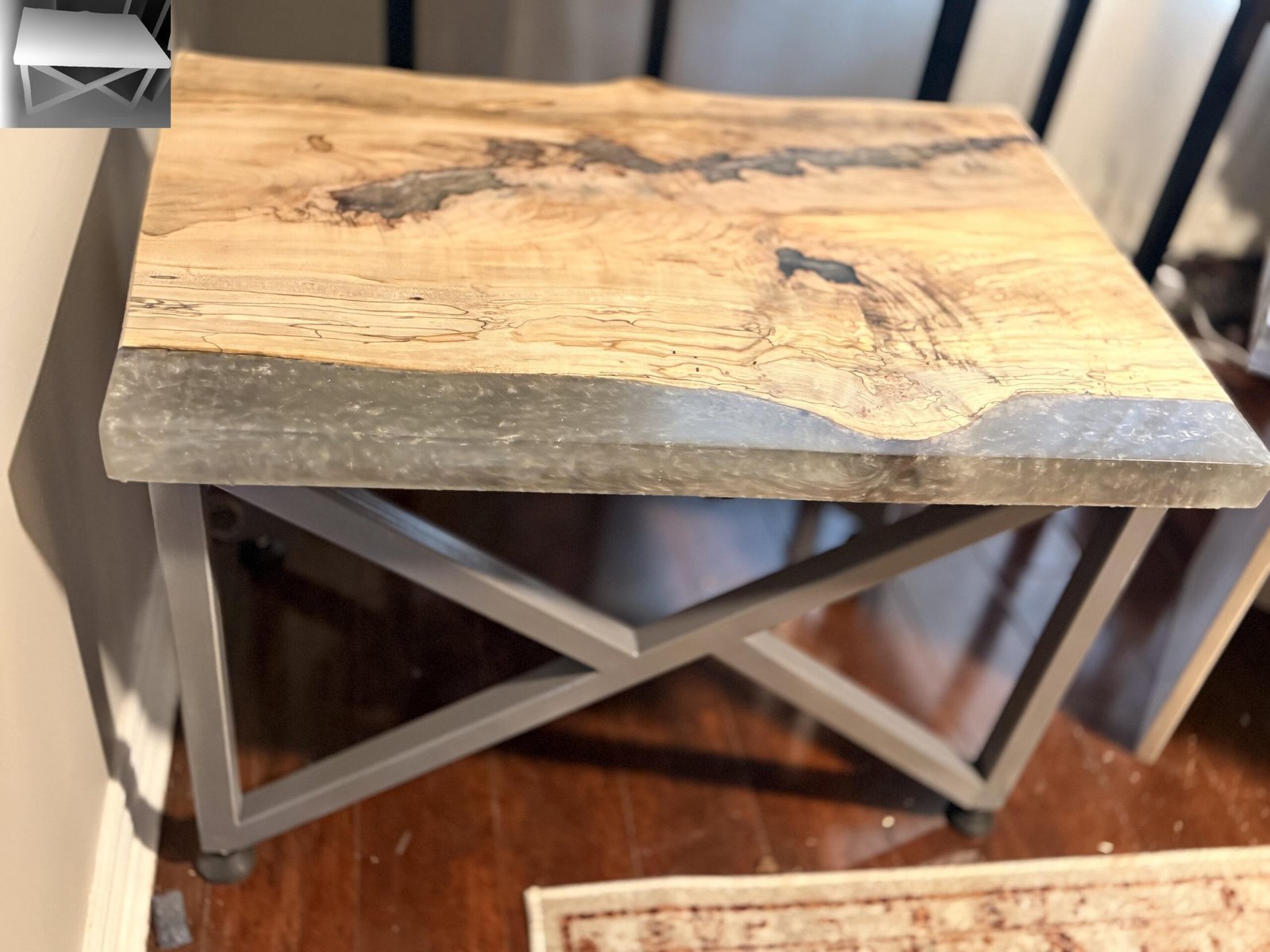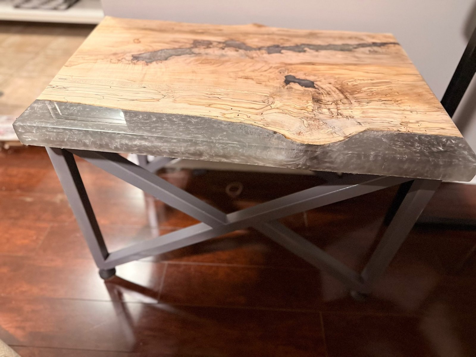 Dimensions: 24″ W x 24″ D x 24″ H | Materials: Epoxy Resin, Custom Steel Legs & Hardwood Accents | Care: Wipe with soft cloth; avoid direct sunlight | Ships in 10-14 business days.